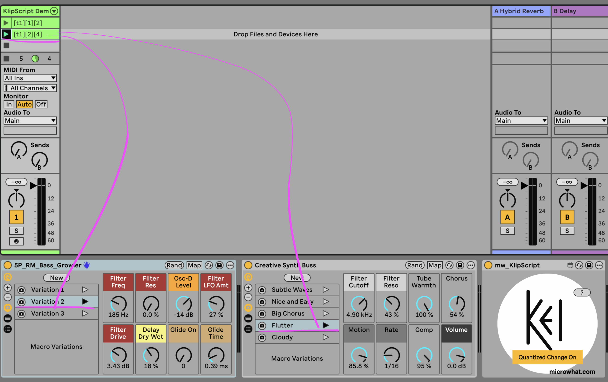 mw_KlipScript is a script language embedded in clip names that executes functions when clips launch in Ableton Live. Write short scripts directly in your clip names to control rack variations, target different tracks, and randomize parameters—all triggered automatically when clips play.